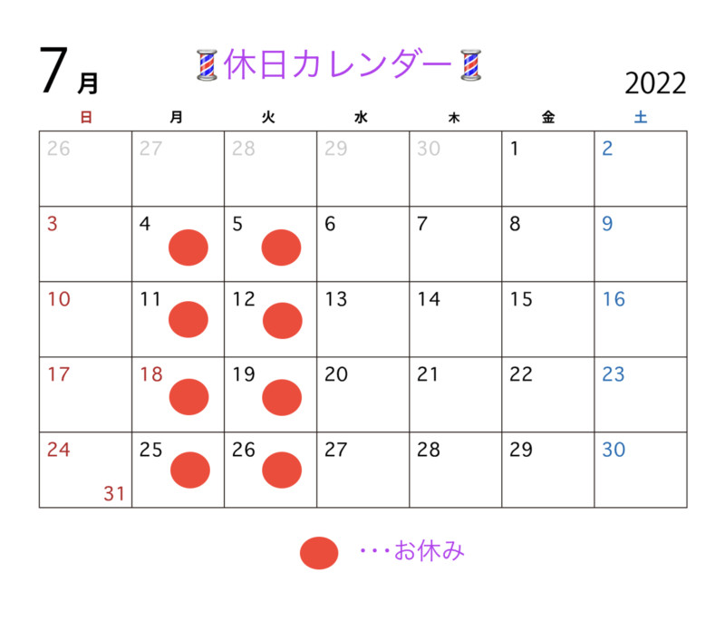 2022年 7月のお休み